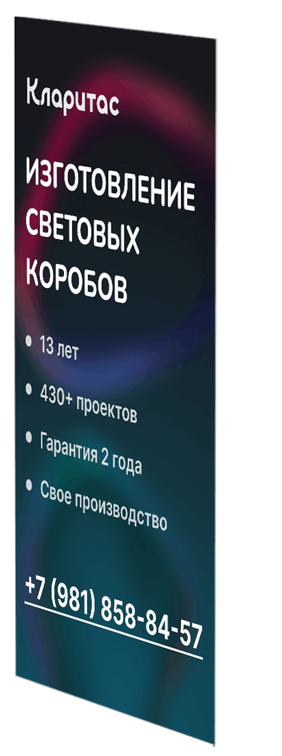 Защита от влаги, пыли и перепадов температур. Световой короб изготавливается с применением влагозащищенных материалов, что гарантирует долговечность в климате Санкт-Петербурга.